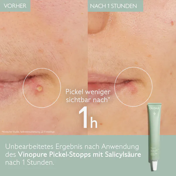 Der Vinopure Pickel-Stopp reduziert Pickel sichtbar in 1 h*. Er reinigt, trocknet aus und mildert dank seiner hellgrünen Textur Rötungen. Das handliche Format können Sie ideal überallhin mitnehmen und somit Unreinheiten den ganzen Tag über weiter behandeln.